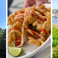 Two soft shell cod tacos with avocado, sriracha chili sauce, chipotle mayo, lettuce, tomato, & red onion